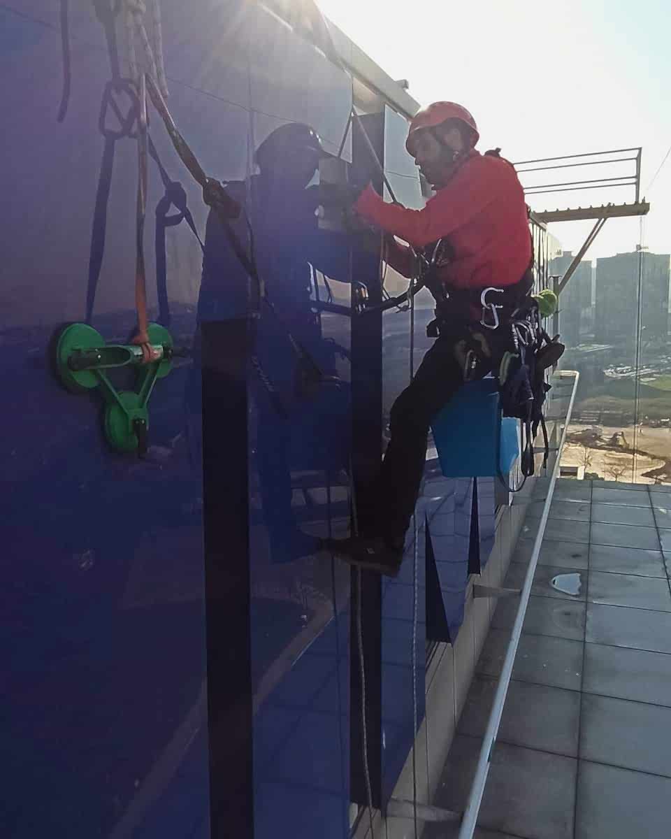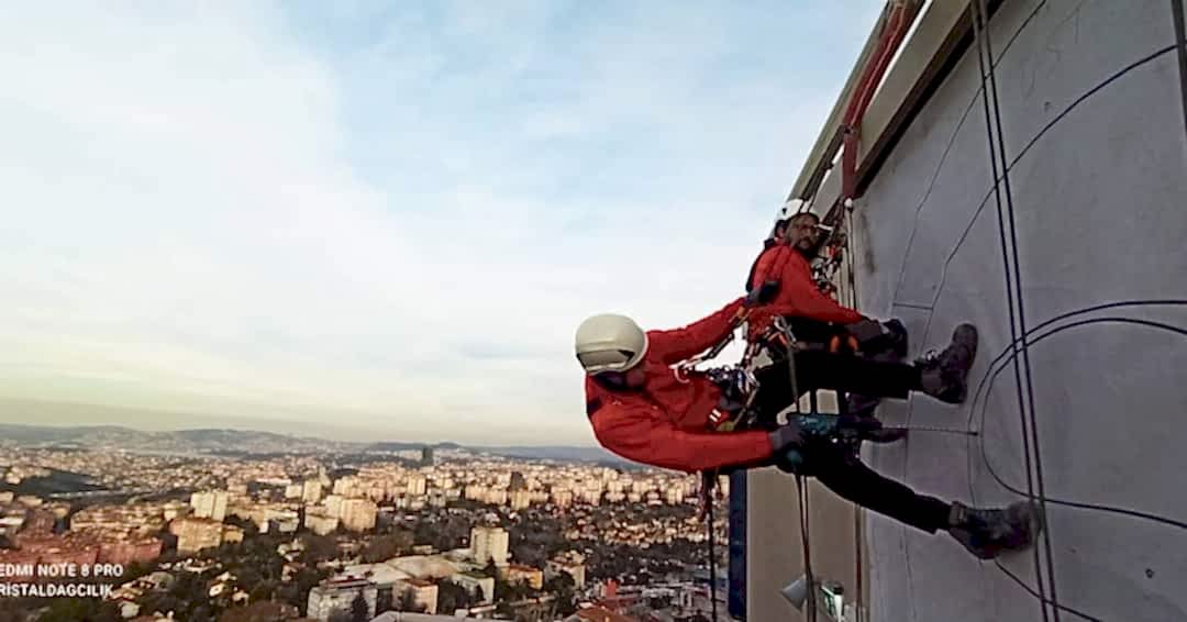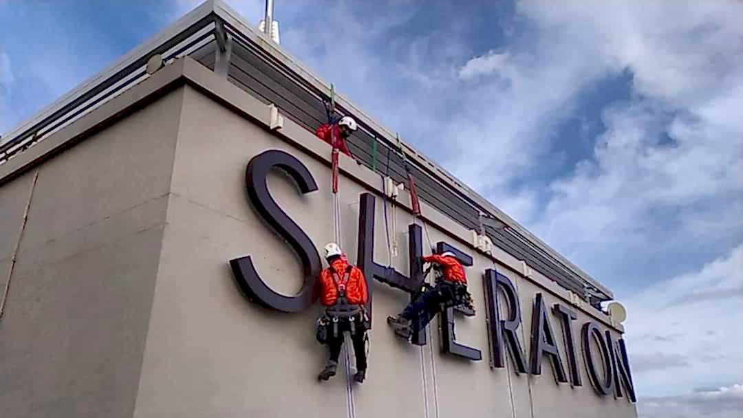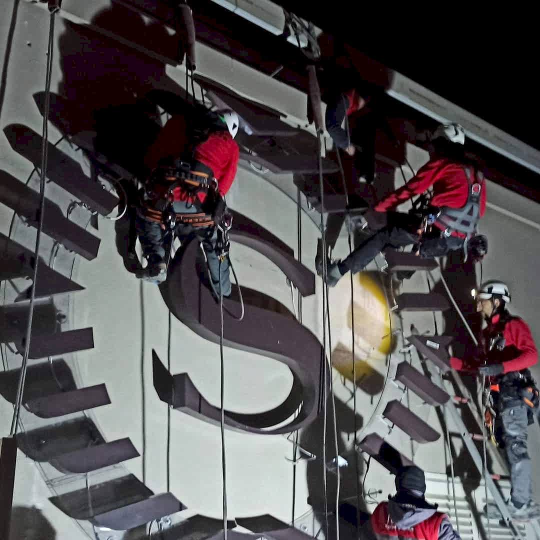 İş, her türlü hava koşulunda binaların çatılarına ve cephelerine yüksek kaliteli reklam yerleştirilmesine izin veren profesyonel dağcılar tarafından gerçekleştirilir.